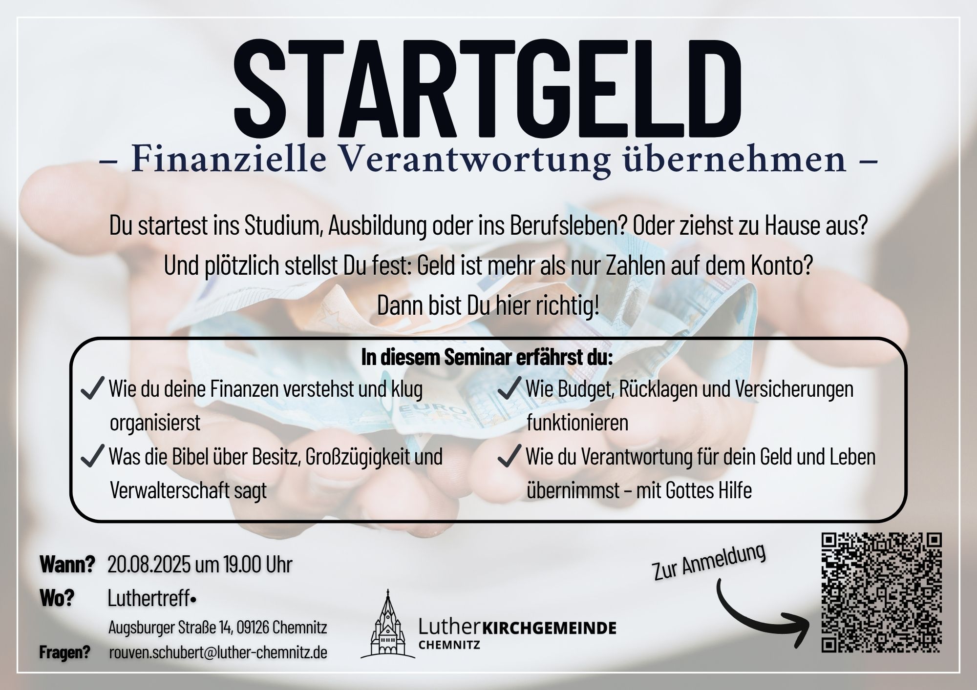 Wir laden junge Erwachsene herzlich zum Themenabend „Startgeld - finanzielle Verantwortung übernehmen“ am 20.08.2025 um 19:00 Uhr in den Luthertreff. ein.
