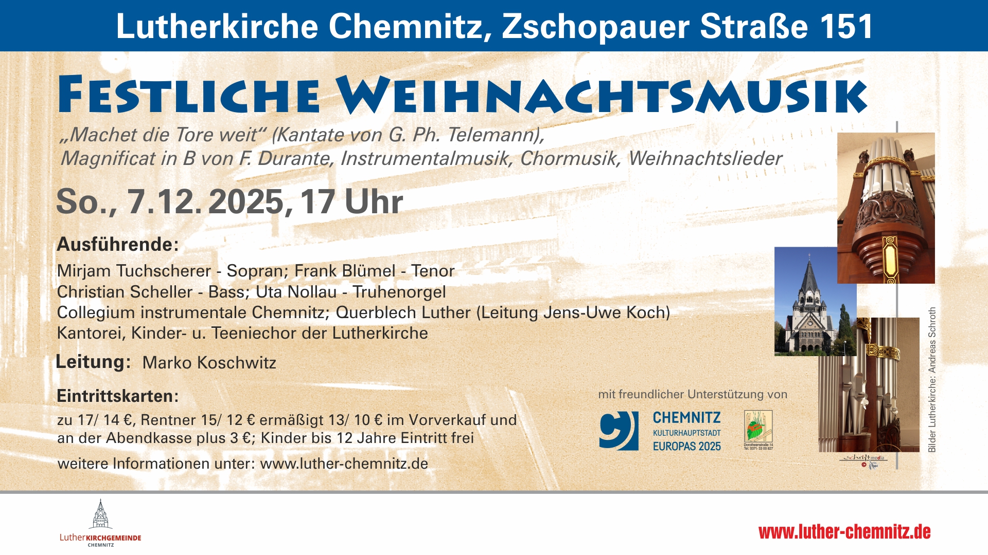 Sonntag, 07.12.2025, 09:30 Uhr, Gottesdienst mit Abendmahl. Es predigt Pfr. Jens Oehme. Die Schatzinsel, das Spatzennest und V.I.T. finden statt.