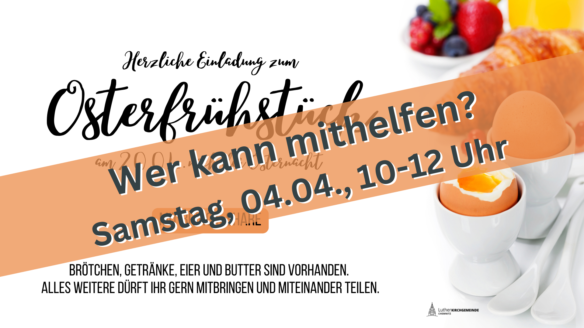 Wir suchen motivierte Unterstützung für das Osterfrühstück und freuen uns auf tatkräftige Mithelfer. Bei Interesse bitte im Pfarramt melden.