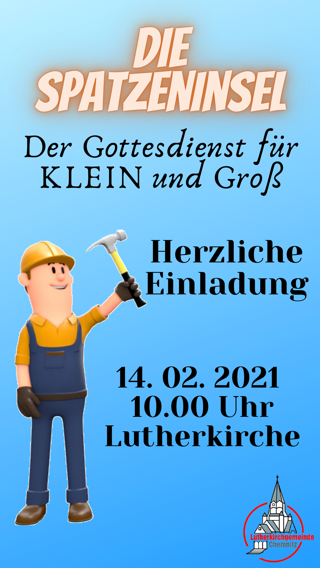 • Sonntag, 14.02.2021, 10:00 Uhr, Spatzeninselgottesdienst für Klein und Groß. Dieser Gottesdienst wird per Livestream übertragen. Die Anmeldung ist unter ticket.luther-chemnitz.de zu finden. VIT (Programm für 5.-8.Klasse) findet statt.