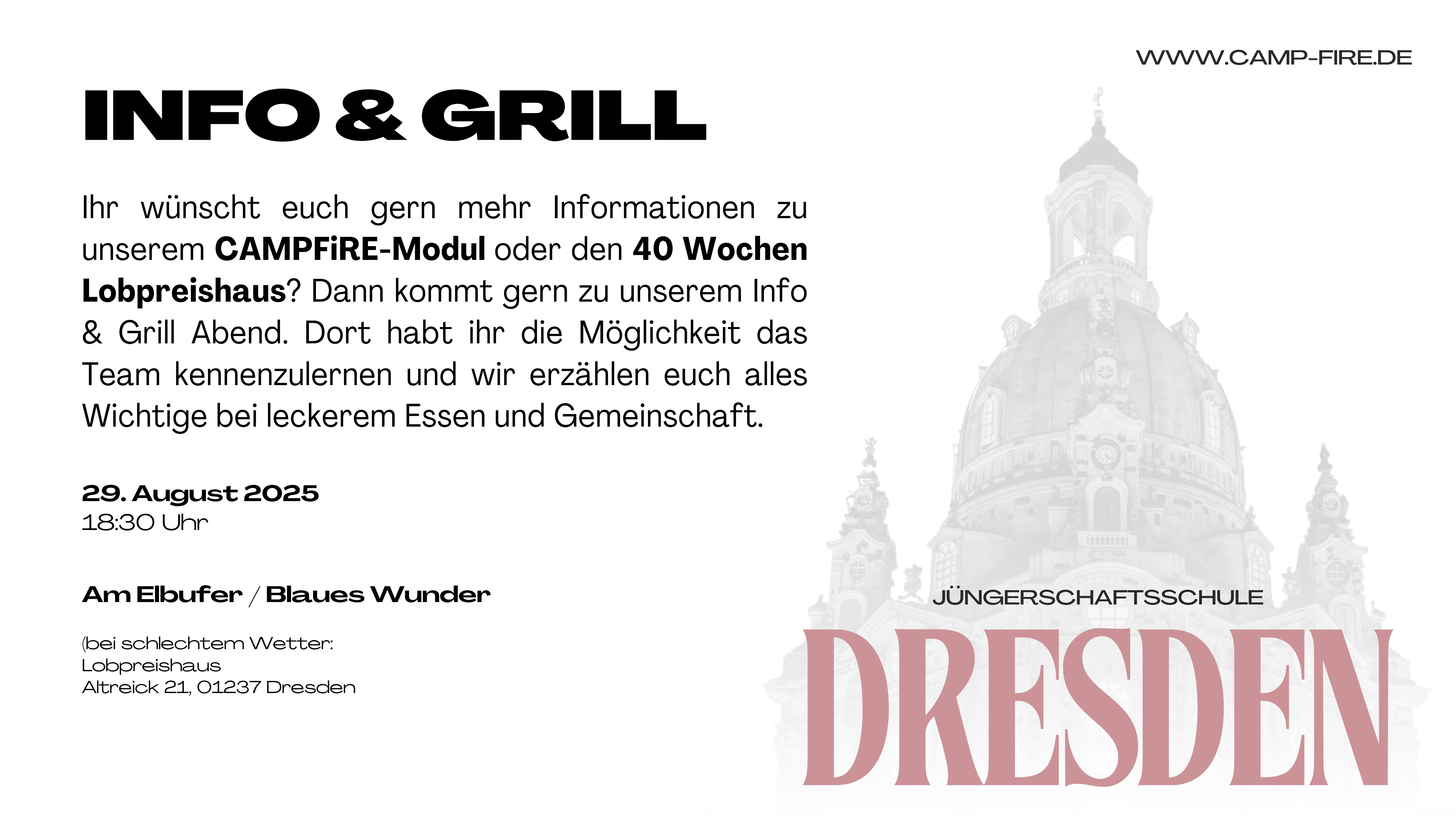 CAMPFiRE Jüngerschaftsschule lädt herzlich zu einem Info- und Grillabend am Freitag, dem 29.08.2025, ab 18:30 Uhr in Dresden ein.